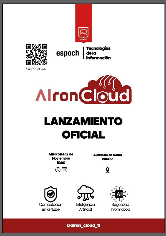 La Carrera de Tecnologías de la Información de la ESPOCH invita a toda la comunidad politécnica al lanzamiento oficial del Club Académico Estudiantil AironCloud, un espacio innovador creado para fomentar el aprendizaje, la investigación y el desarrollo tecnológico en tres ejes fundamentales de la era digital: Computación en la Nube, Inteligencia Artificial y Ciberseguridad. Este evento se llevará a cabo el miércoles 12 de noviembre a las 10h00 en el Auditorio de Salud Pública, donde se presentará la visión, objetivos y actividades del club que busca impulsar el talento estudiantil hacia soluciones inteligentes y sostenibles. ¡Sé parte del cambio tecnológico y acompáñanos en esta nueva etapa de innovación académica!