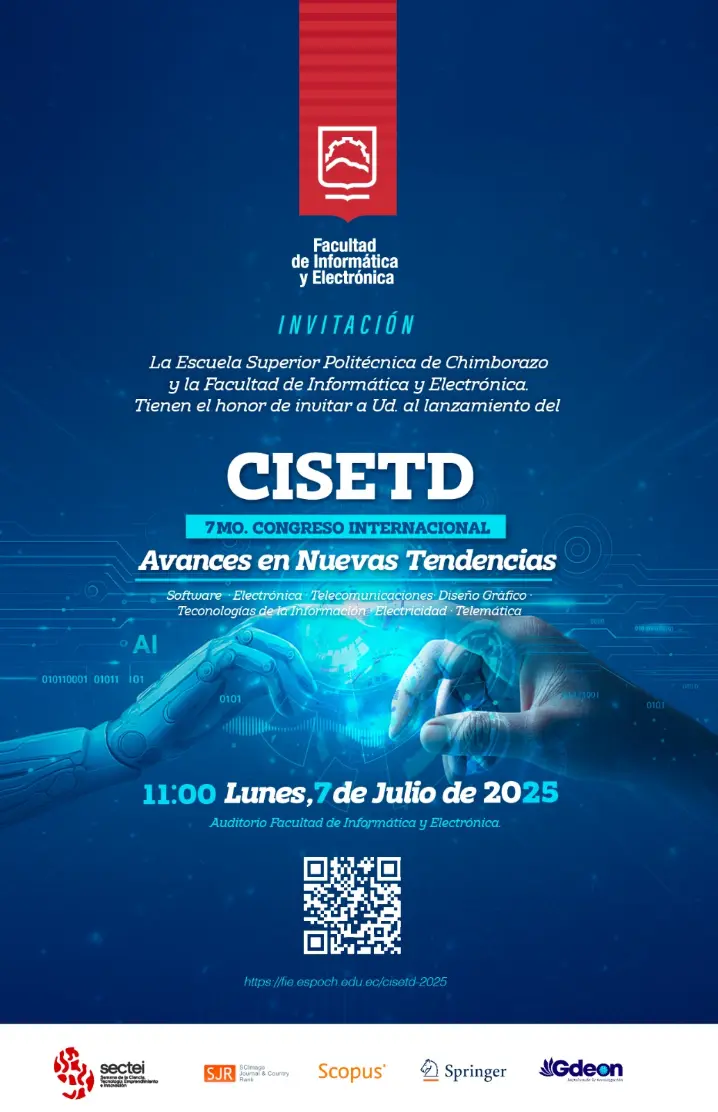 El lunes 7 de julio de 2025, a las 11h00, se llevará a cabo el lanzamiento del 7mo Congreso Internacional de Software, Electrónica, Telecomunicaciones, Diseño Tecnologías de la Información y Telemática (CISETD) en el auditorio de la Facultad de Informática y Electrónica de la Escuela Superior Politécnica de Chimborazo, en Riobamba, Ecuador. Este congreso, que se celebrará del 16 al 17 de octubre de 2025 en modalidad híbrida (presencial y virtual), tiene como objetivo reunir a destacados investigadores y profesionales del ámbito informático para intercambiar conocimientos y explorar oportunidades de colaboración. CISETD 2025 es organizado por la Facultad de Informática y Electrónica y cuenta con el apoyo de GDEON®.