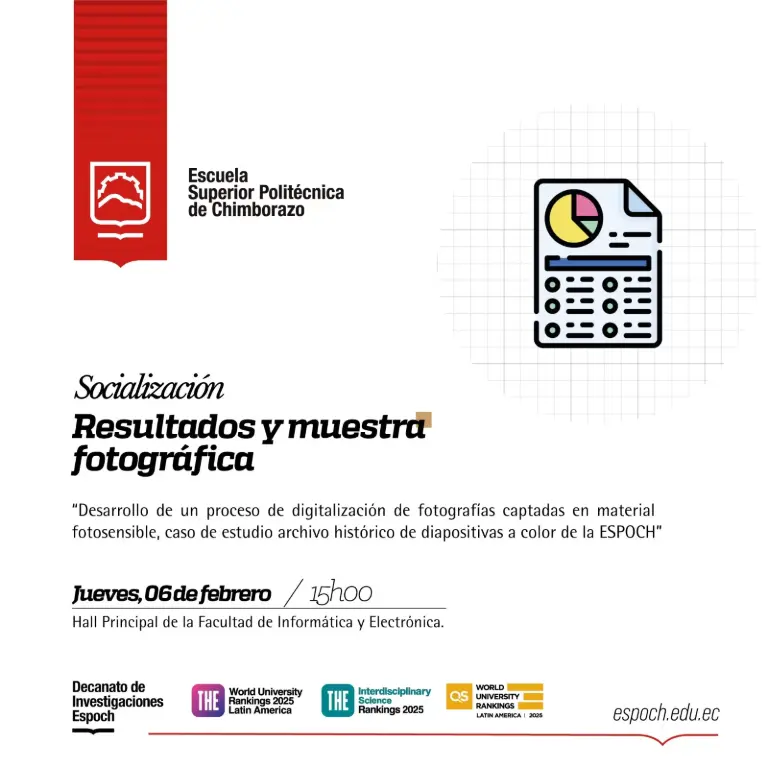 La #ESPOCH, a través del Decanato de Investigaciones, invita a la socialización del proyecto “Desarrollo de un proceso de digitalización de fotografías captadas en material fotosensible: Caso de estudio, archivo histórico de diapositivas a color de la ESPOCH”.Como parte de este proyecto, se presentará la muestra fotográfica “Alquimistas de la Memoria”, que pone en valor la riqueza histórica de la institución y rescata momentos emblemáticos de su trayectoria.#HacemosHistoria